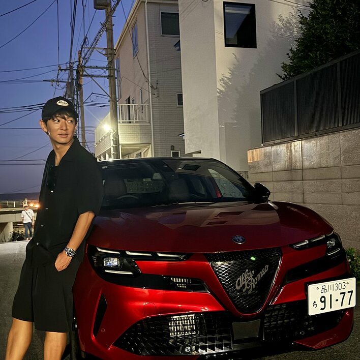そんな大倉さんですが、今回の投稿では「日本に上陸したばかりのAlfa Romeo JUNIORに乗ってドライブ」とつづり、道端にとめられた鮮やかな赤色に輝く車に寄り添うショットを公開しました。