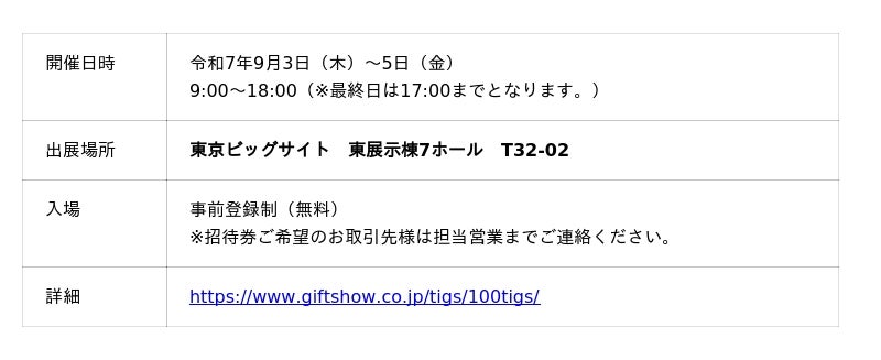 株式会社CUE(本社:大阪市西区土佐堀1-5-11 KDX土佐堀ビル3F 代表取締役:杉本さやか)は、東京ビッグサイトで開催される、「第100回 東京インターナショナルギフト・ショー 秋2025」へ出展いたします。