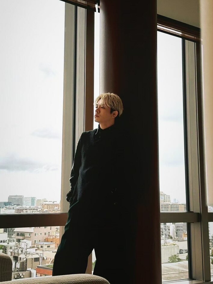 高層ビルを見下ろすように部屋の窓際にたたずみ、何かに思いを巡らせているかのように、遠くを見つめています。