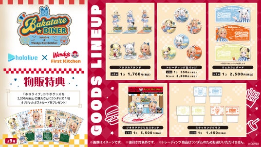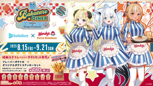 合同会社DMM.com(本社:東京都港区、会長 兼 CEO亀山敬司、以下DMM )が展開するグッズメーカーサービス「DMM Factory」は、ウェンディーズ・ジャパン株式会社およびファーストキッチン株式会社(所在地:東京都新宿区、代表取締役社長:紫関修)が運営する、「ウェンディーズ・ ファーストキッチン」および「ファーストキッチン」にて、カバー株式会社(本社:東京都港区、代表取締役社長:谷郷元昭)が運営する「ホロライブプロダクション」傘下の女性VTuberグループ「ホロライブ」の所属VTuberの白上フブキ・不知火フレア・角巻わための「バカタレ共」のコラボイベント『BAKATARE DINER』を期間限定で開催中です。