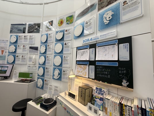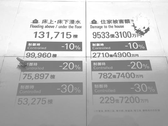 展示では、過去の大型台風をモデルに、巨大な地図上で進路や勢力の変化をシミュレーション。さらに、床上・床下浸水や住宅被害額が台風制御によってどれほど抑えられる可能性があるのかを、数値としてわかりやすく可視化します。こうした工夫により、来場者は台風災害リスクの低減に向けた研究の可能性を“目で見て”理解できる、迫力ある動く展示が見られました。