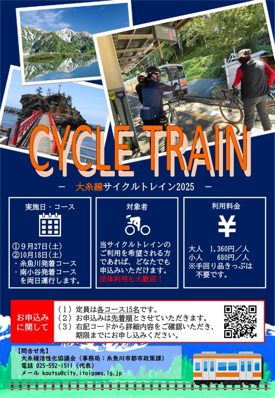 大糸線活性化協議会(事務局:糸魚川市都市政策課)では、松本駅(長野県松本市)から糸魚川駅(新潟県糸魚川市)を結ぶ鉄道路線JR大糸線内の糸魚川駅~南小谷駅間において、自転車をそのまま車内に持ち込める「サイクルトレイン」を運行します。自転車を降り畳んで輪行バッグに入れることなくそのまま列車に積み込んで移動できます。自転車と一緒に、気軽な電車旅とサイクリングをお楽しみいただけます。