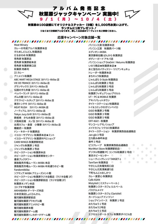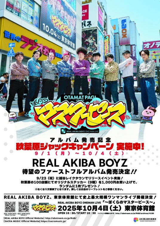 クリエイターレーベル「METEORA st.」所属のアニソンダンスパフォーマー REAL AKIBA BOYZ は、9月24日(水)発売の初のフルアルバム『ぼくらのマスターピース』と、10月4日(土)開催のワンマンライブ「REAL AKIBA BOYZ ONEMAN LIVE ~僕らのマスターピース~」を記念して、秋葉原エリア約100店舗による「秋葉原ジャックキャンペーン」を開始いたしました。