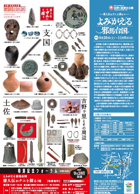 JR九州エージェンシー株式会社が管理委託業務に参加する国営吉野ヶ里歴史公園では、特別企画展「よみがえる邪馬台国」を開催します。17回目となる今年はシリーズ「倭人伝のクニを探る」の第7弾として、「一(い)支(き)国(こく)」に想定される長崎県壱岐市と、四国の土佐地域の遺跡群を取り上げ、それらと吉野ヶ里遺跡との内容を比較しながら邪馬台国の謎に迫ります。