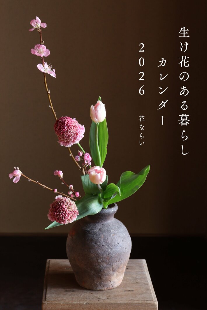 桃、桜、百合など和の花と、チューリップ、バラ、ラナンキュラスなど洋の花を組み合わせた、モダンな生け花作品がSNSで人気の「花ならい」のカレンダーが新登場。