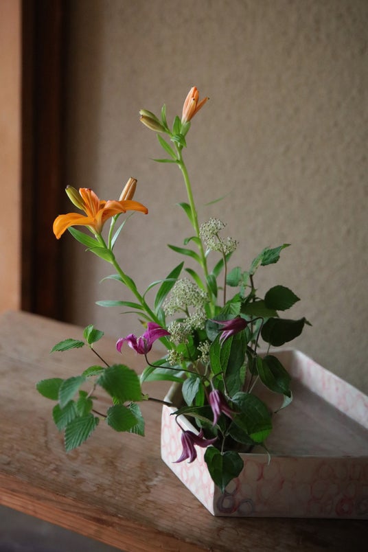 結婚を機に京都に移住した安達さんが、ときに可愛らしく、ときにダイナミックに季節の花を生ける作品は、ただ花の美しさを伝えるだけでなく、自然の風景をそのまま切り取ったような、その季節の風やにおいまでをも感じられるような魅力があります。