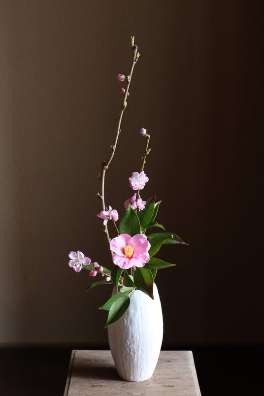 桃の枝の直線を生かし、春を迎える喜びを表現します。一方で、足下に咲く椿は厳しい寒さがまだ残っていることを暗示します。