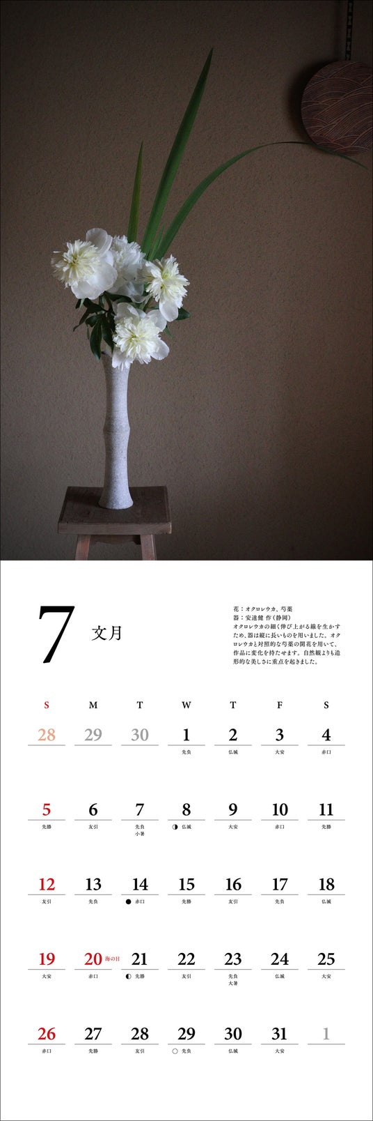 また、掲載作品の一つひとつに、使用している花の種類と器、生ける際のポイントや見どころなどの解説が付いているので、カレンダーを見ながら自分なりの生け花を生けてみる、という楽しみ方もできます。