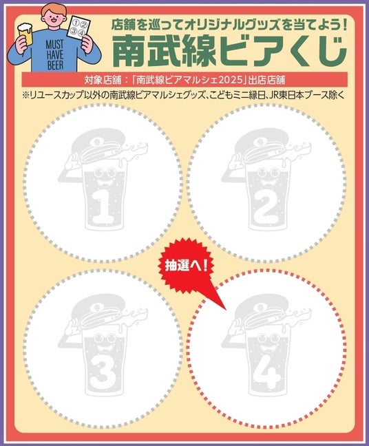 今回も会場内にて、出店ブルワリーのグッズが当たる「南武線ビアくじ」を実施します!出店店舗を巡って商品を購入し、スタンプを集めると抽選くじにご参加いただけます。オリジナルリユースカップの購入でも、スタンプを1つ付与します。