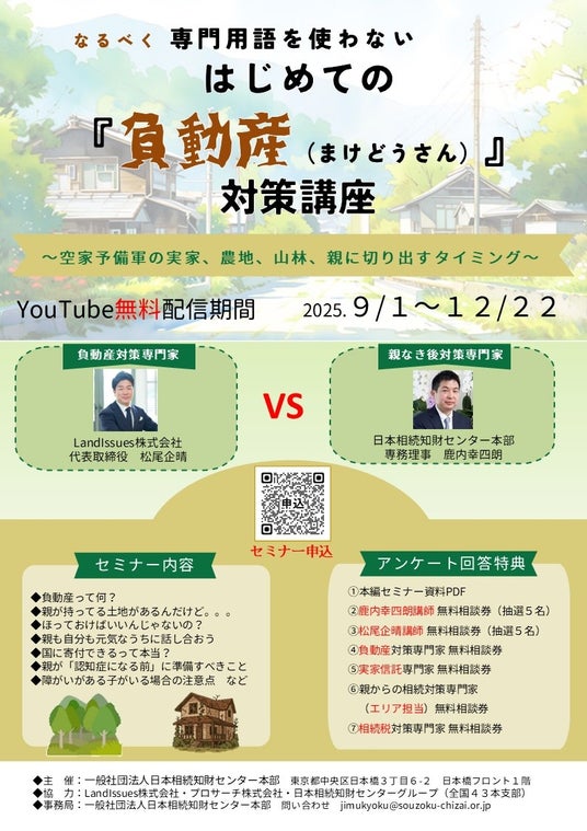 2025年9月1日、一般社団法人日本相続知財センター本部(所在地:東京都中央区)は、専門用語を使わない初心者向けWebセミナー『はじめての「負動産(まけどうさん)」対策講座』の無料配信を開始しました。