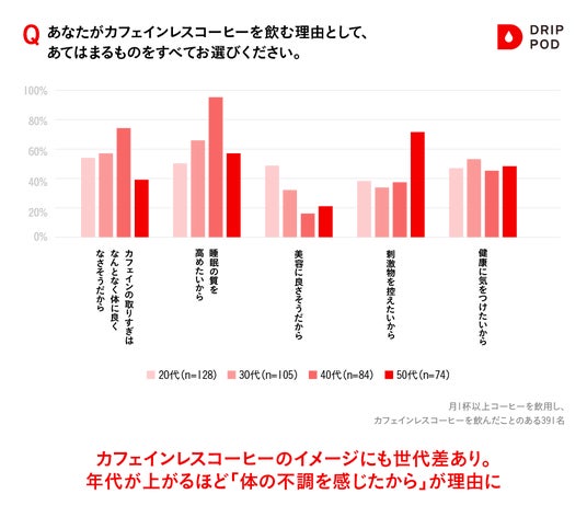 また、カフェインレスコーヒー飲用経験者に対し、カフェインレスコーヒーを飲む理由を聞いたところ、「カフェインの取りすぎはなんとなく体に良くなさそうだから」「睡眠の質を高めたいから」「美容に良さそうだから」といったイメージによる項目があがりました。20代においては、「カフェインの摂りすぎはなんとなく体に良くなさそうだから」という項目が1位だったことに対して、30~50代は「睡眠の質を高めたいから」という項目が1位になりました。年代があがるごとに、イメージによるカフェインレスの選択ではなく、実際に不調を感じてカフェインレスを手に取る人が増えるのではと推察されます。