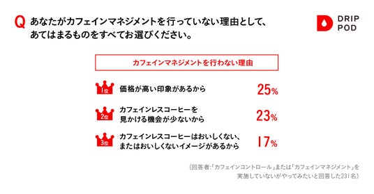 「カフェインマネジメント」をやってみたいと答えた人に対し、カフェインマネジメントを行っていない理由を聞いたところ、「価格が高い印象がある」「見かける機会が少ない」「カフェインレスコーヒーはおいしくない、またはおいしくないイメージがある」という回答がTOP3にあがりました。