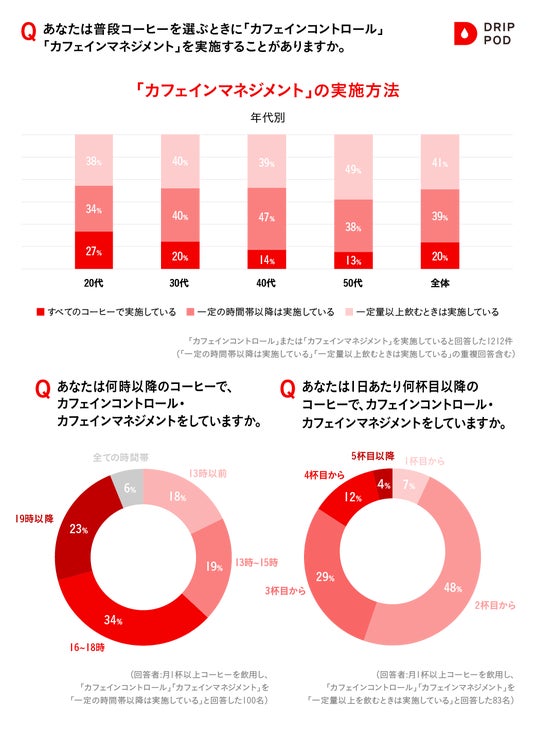 実際どのように「カフェインマネジメント」を取り入れているかを聴取したところ、時間帯や杯数など、ご自身のコーヒーの飲用スタイルで調整している人がすべてのコーヒーで実施している人よりも多いようでした。時間帯では夜だけ、というよりも、お昼をすぎたあたりから意識し始める人が多いようです。また、杯数で調整している人は2杯目から気にする人が多く、「1日1杯派」も半数ほど存在しているようです。