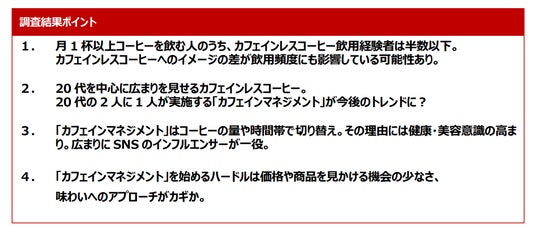 これらの調査結果より、カフェインレスコーヒーに対して、体にやさしいイメージがありながらも、味わいへの不安や、選択肢の少なさ、価格を懸念して飲用に至っていないケースがあることがわかりました。また一方で、1日のなかでカフェイン摂取量を調整する「カフェインマネジメント」といったスタイルが20代を中心に徐々に広がりつつあることも見て取れます。