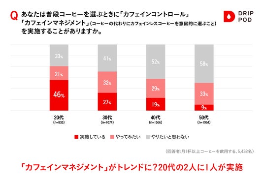 そういった背景も踏まえ、20代には1日のなかでカフェイン摂取量を調整するスタイルが定着しつつあることも調査から明らかになりました。コーヒーの代わりにカフェインレスコーヒーを意図的に選ぶように、カフェインの摂取量を調整することを「カフェインコントロール」または「カフェインマネジメント」といいます。普段のコーヒーで「カフェインコントロール」「カフェインマネジメント」の実施有無を聞いたところ、20代の約半数が「実施している」と回答。さらに、「やってみたい」という意向も含めると、約7割の人がカフェイン摂取量の調整に対し高い興味があることがわかりました。20代は特に、カフェイン摂取量やそれらを1日のなかで調整することに対する関心の高さがうかがえる結果となりました。