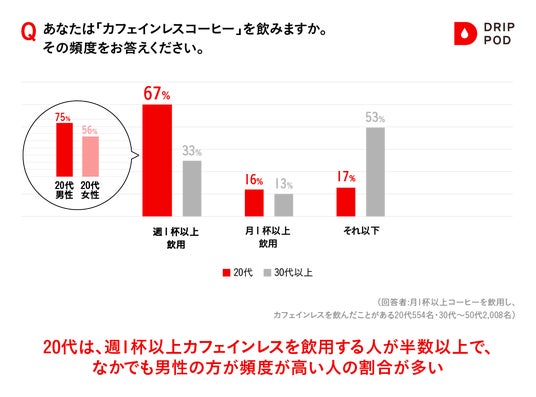 年代ごとにカフェインレスコーヒーの飲用経験をきくと、20代では約7割が飲用経験ありと回答。30代以上の4割と比べると高いスコアとなりました。また、飲用頻度も聴取したところ、20代においては週1杯以上飲用する人が約7割と高く、今までに飲用“したことがある”というだけでなく、実際に普段から手に取る機会も多いようです。また、男女で比較すると、男性の方が女性よりも週1杯以上飲用している人の割合が高いということが分かりました。20代にとっては「カフェインレスコーヒー」という選択肢はマイナーなものではないということを見て取ることができます。