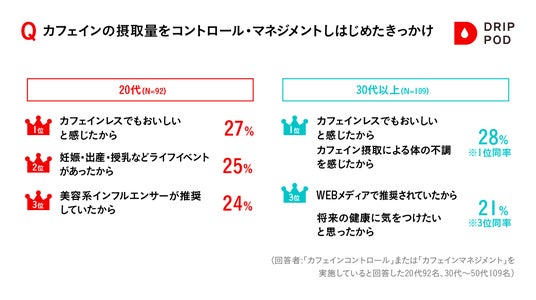 次に、「カフェインマネジメント」を始めたきっかけを聴取したところ、まず全年代において、第一に「カフェインレスでもおいしいと感じたから」と味わいに対するポジティブなイメージがあがりました。年代別で見ていくと、20代は妊娠などのライフイベントに次いで美容系インフルエンサーの推奨があがり、SNSの影響の大きさをうかがい知れる結果となりました。一方で30代以上ではカフェイン摂取による体の不調や将来の健康に気をつけたいと思ったからといった項目があがりました。