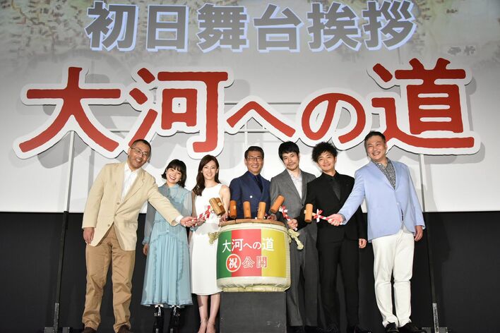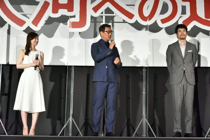 映画「大河への道」初日舞台挨拶が行われ、主演の中井貴一さん、共演の松山ケンイチさん、北川景子さん、岸井ゆきのさん、和田正人さん、田中美央さん、中西健二監督が出席しました。