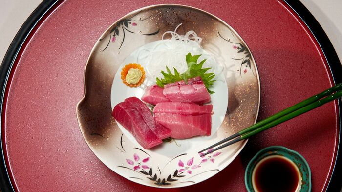 程よい脂のリが絶品の「マグロのお造り」を口に入れた松岡さんは、「本マグロならではの脂のうまみがフワッときますね」とうれしそうにコメント。