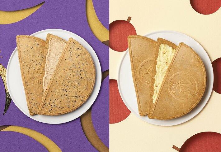 『鎌倉半月』は、カリッ、サクッ、パリン、と“食感”にこだわった「鎌倉五郎本店」のロングセラー。愛らしい月うさぎを描いた大きな半月型のゴーフレットに、ふわっと軽いクリームをたっぷりはさみました。そんな『鎌倉半月』から、毎年秋冬だけの味わい「りんご」と「ごま」が今年も登場です!