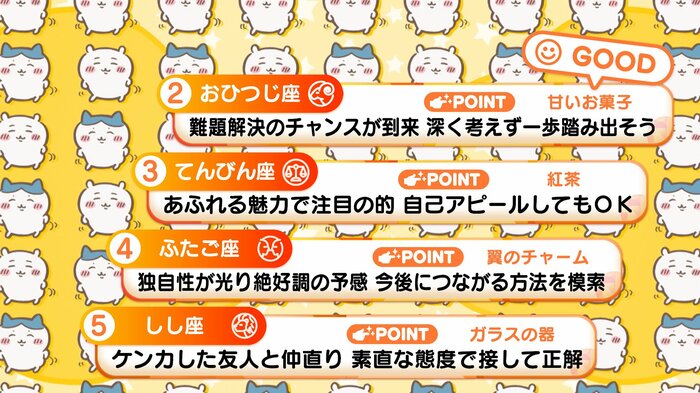『めざましテレビ』で放送中の「ちいかわ占い」 テレビ放送がない日はお休みで、月~土:朝7時以降に更新予定です。