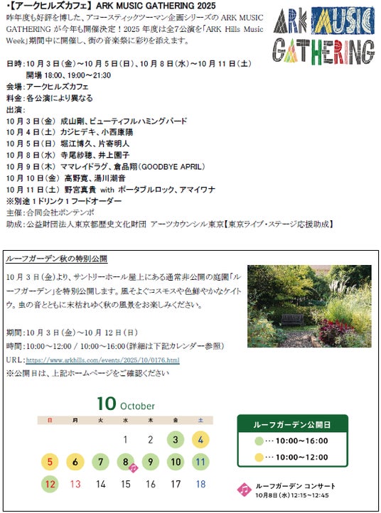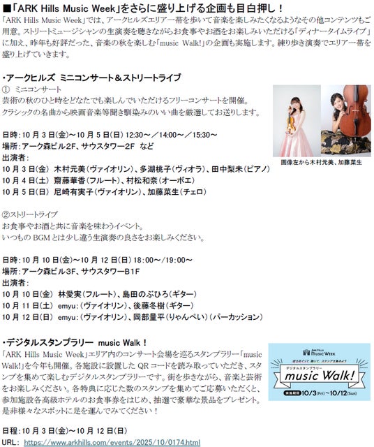 森ビル株式会社(東京都港区、代表取締役社長 辻 慎吾)が運営するアークヒルズ(東京都港区)では、10月 3日(金)~10月12日(日)の10日間、隣接するサントリーホールと共同で「ARK Hills Music Week 2025」を開催します。