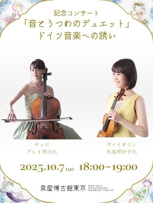 【泉屋博古館東京】記念コンサート「音とうつわのデュエット」ドイツ音楽への誘い特別展「巨匠ハインツ・ヴェルナーの描いた物語(メルヘン)―現代マイセンの磁器芸術」の開催を記念したコンサートです。ヴァイオリンとチェロのデュエットによるドイツ音楽の演奏を、ヨーロッパを代表するドイツの名窯・マイセンで生まれた現代マイセンの名品の数々の展示とともにお楽しみください。