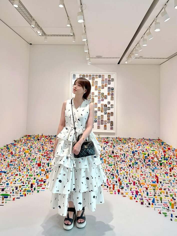 別の投稿では、彫刻の森美術館を訪れた鬼頭さんが、全面に広がったステンドグラスが幻想的な空間でポーズを決めている様子も。