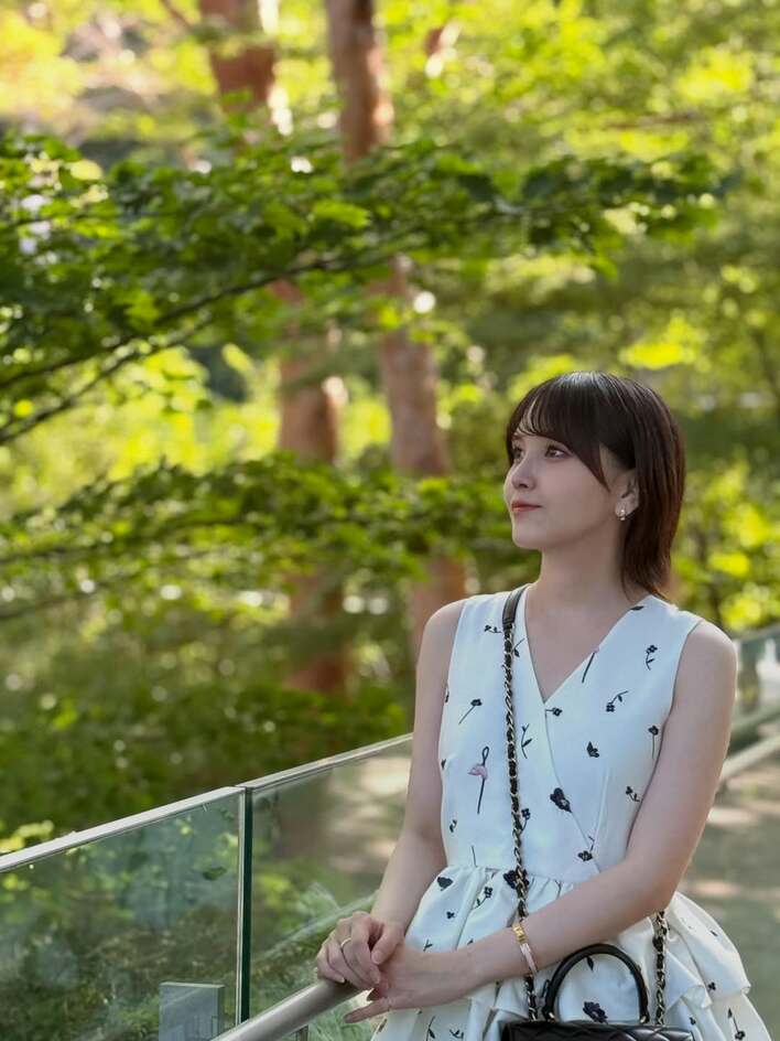 小さな花のデザインがあしらわれた、白いフリルのノースリーブワンピースという夏らしいコーディネートで、遠くを見つめる鬼頭さんの横顔に思わず見とれてしまいます。