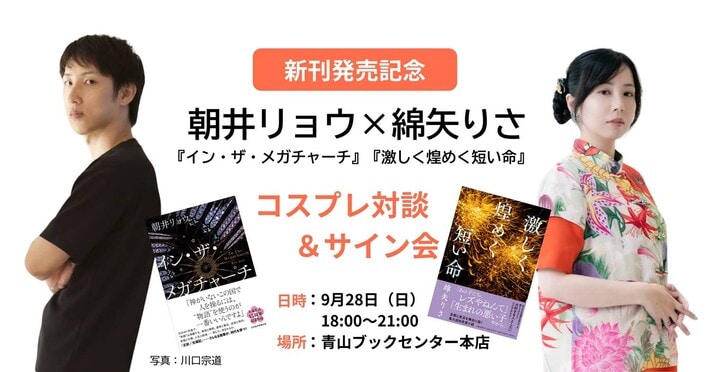 綿矢りささんの集大成とも言える恋愛長編小説『激しく煌めく短い命』(文藝春秋)と朝井リョウさん作家生活15周年記念作品である『イン・ザ・メガチャーチ』(日経BP 日本経済新聞出版)の発売を記念して、「綿矢りさ×朝井リョウ コスプレ対談&サイン会」を、9月28日(日)18時~、青山ブックセンター本店にて開催いたします。