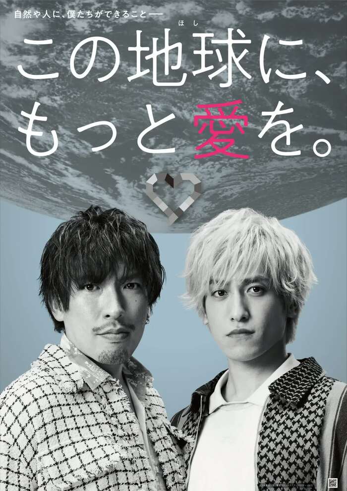 まずひとつめは、モノクロでいつもテレビでは見ることができないEXITの真剣な表情から「このままでは地球は持続可能じゃない」という危機感を表現しつつ、そこに地球やそこで暮らす人々へ「もっと愛を。」というメッセージが載っています。