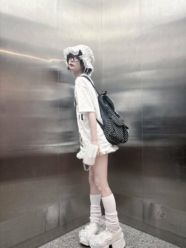 横を向いたショットでは、デコレーションが付いた大きな靴とルーズソックスが相まって、美脚が際立っています。また、カバン以外全身白で統一されていて、甘めなコーデが印象的です。