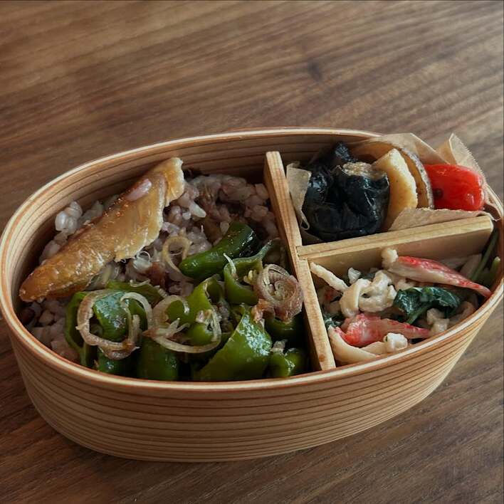 雑穀米の上には、小さく切られた焼き魚に、ピーマンとみょうがの炒め物が。