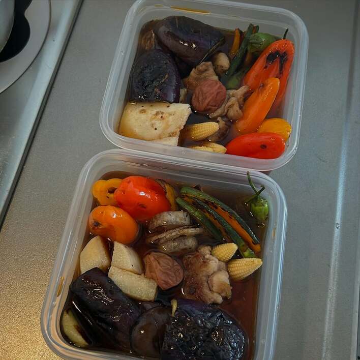 煮浸しを作り置きしたようで、二つ並んだ食品保存容器を公開。
