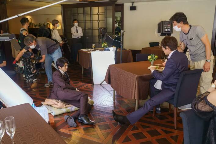 そして、いよいよ最後の撮影。同じレストラン内の、別の席に座っていた東堂がわざと出した足に、匡が引っかかって床に転倒するという場面です。