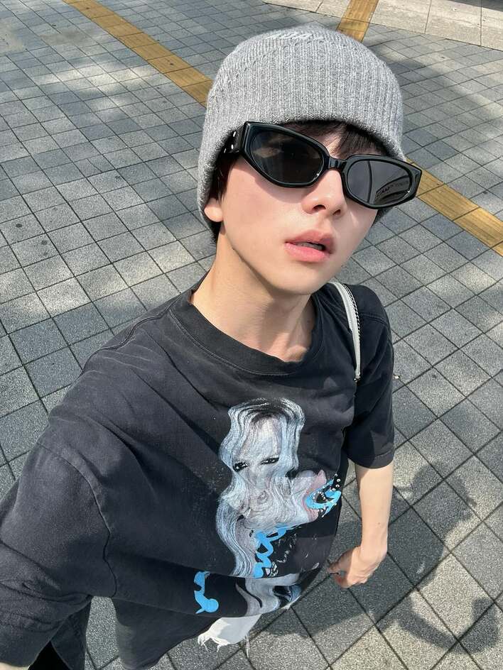 黒のグラフィックTシャツに、グレーのニット帽と大きな黒のサングラスを合わせた、カジュアルコーデで、上アングルからの自撮りショットを披露。