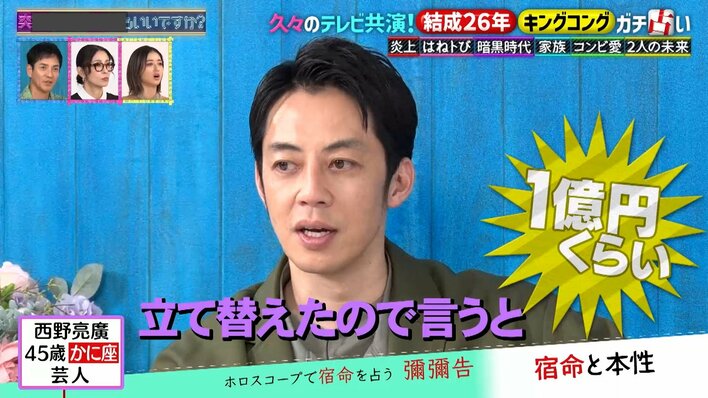 その理由は、占いによると、一度信用すると“お世話大好き魔神”になるという西野さんの性格が関係しているそう。西野さんは、周囲からのあらゆる相談に力を貸してきたと言い「立て替えた金額で言うと1億円くらい」と告白し、驚かせました。