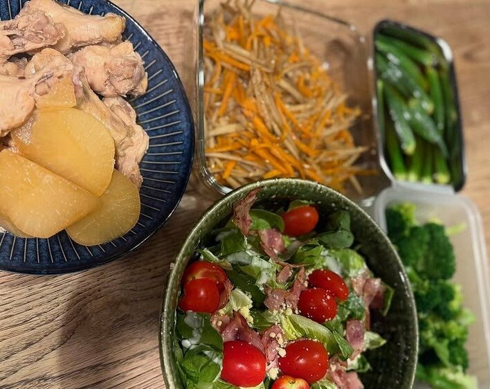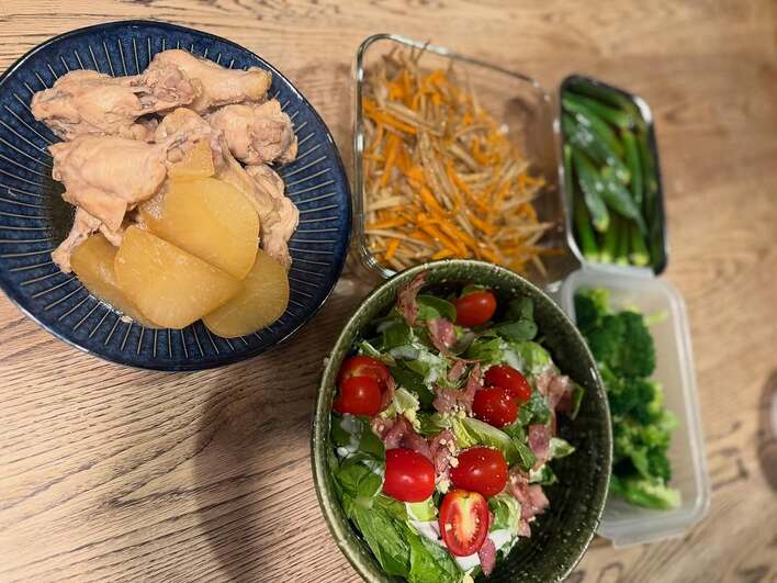 大きな和食器には、じっくり煮込んだ手羽元と大根。グリーンのボウルには、葉物やミニトマト、こんがり焼いたベーコンや粉チーズがかけられています。