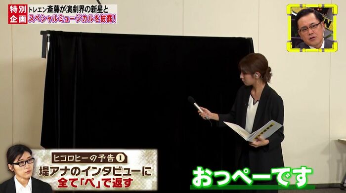 堤アナからの「斎藤さんにとってミュージカルとは?」という質問に「ぺっぺぺっぺっぺぺぺっぺっぺ…」と回答し、会話になりません。スタジオには、見事に失笑が広がりました。