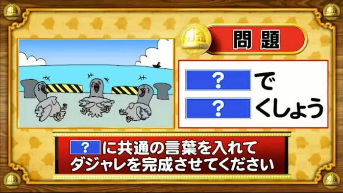 最初は「脳ミングアップクイズ」から、ダジャレ穴埋めの問題。「?」に共通する言葉を入れてダジャレを完成させてください。