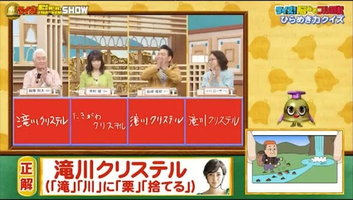 正解は「滝川クリステル(『滝』『川』に『栗』『捨てる』)」。またまた全員正解!