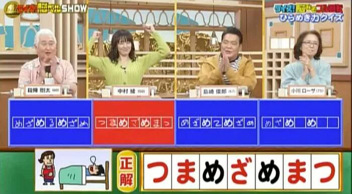 今回の解答者は、俳優・殺陣剛太さん(60)、女優・中村綾さん(50)、タレント・島崎俊郎さん(67)、女優・小川ローザさん(75)の4名です。