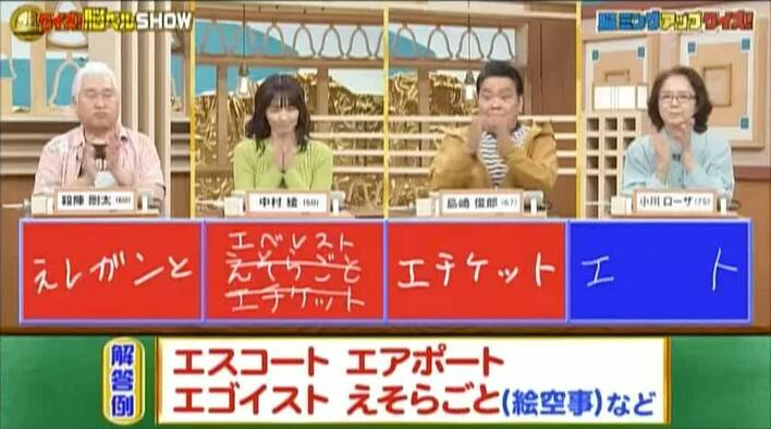 正解は「エスコート」「エアポート」「エゴイスト」「えそらごと(絵空事)」など。殺陣さん、中村さん、島崎さんの3人が正解!