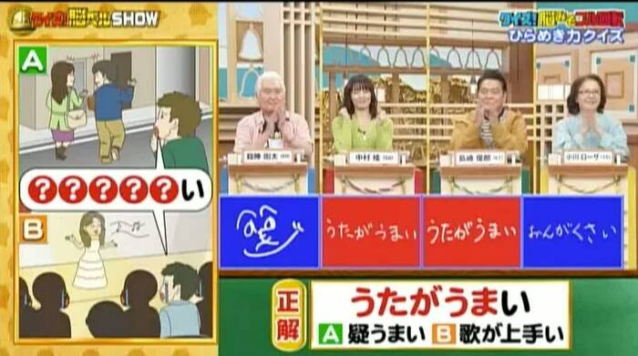 正解は「うたがうまい(疑うまい/歌が上手い)」。中村さんと島崎さんの2人が正解。