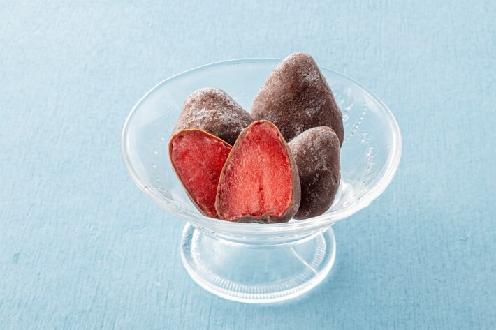 冷凍のチリ産いちごをガーナ産カカオ豆を使用したチョコレートで包み込んでおり、甘酸っぱさとビターな味わいのバランスが絶妙です。