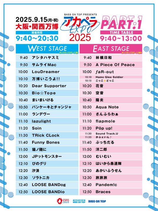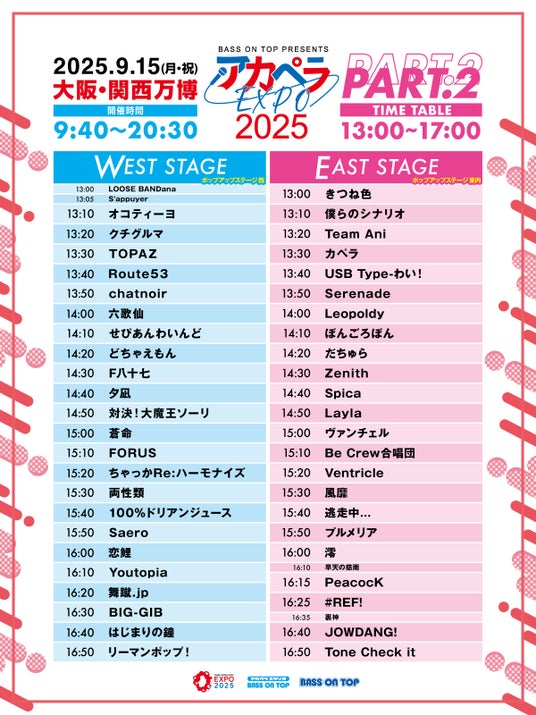アカペラスタジオをはじめバンド・ダンス・ピアノ各種スタジオを展開する株式会社ベースオントップ(本社:大阪市中央区 代表取締役:水守 宏)は、2025年9月15日(月・祝)に大阪・関西万博会場内2ステージで、「アカペラEXPO2025」を開催いたします。
