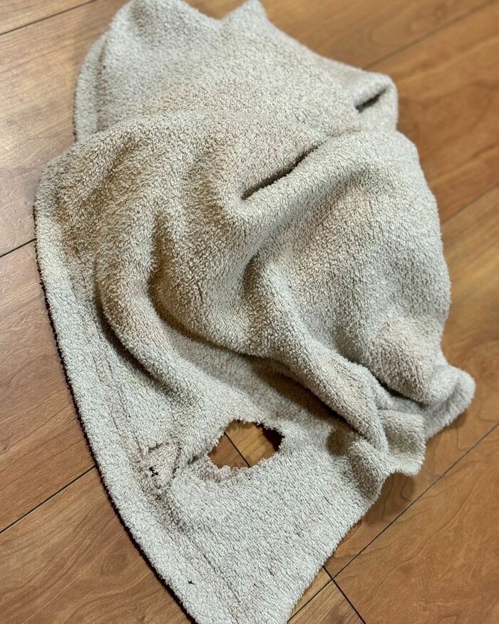 使い込んだことが分かる“破れたブランケット”、「モコモコ」です。