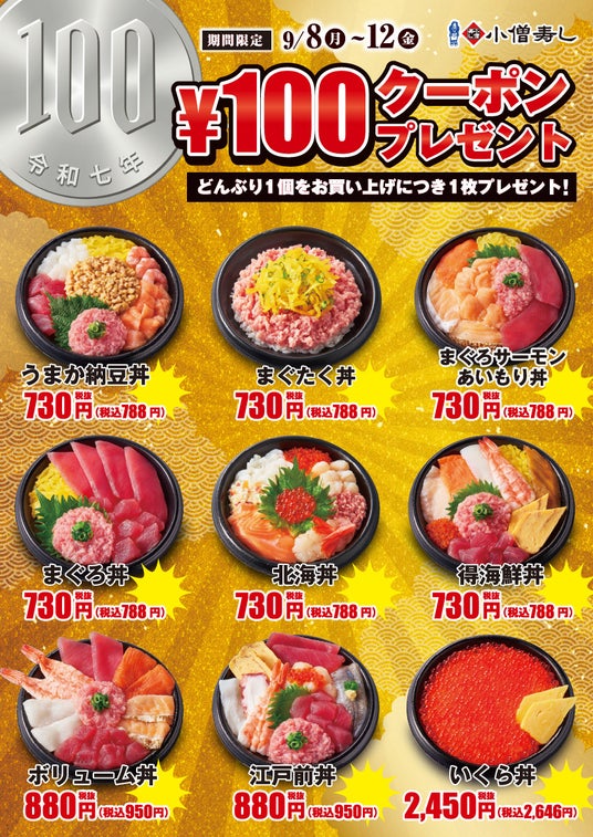 KOZOホールディングス株式会社の子会社である株式会社小僧寿しは、持ち帰りすし店「小僧寿し」にて、2025年9月8日(月)~12日(金)の期間限定で人気商品の『どんぶり』を《100円クーポン付き》で販売いたします!(※店舗により未実施の場合がございます)