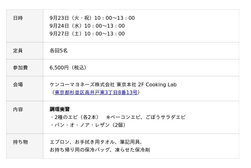 ケンコーマヨネーズ株式会社(東京本社:東京都杉並区、 代表取締役社長:島本 国一、以下「当社」)は、当社で運営する一般のお客様向けの料理教室「キッチンスペース831」にて、9月に開催するレッスンの募集を開始しました。