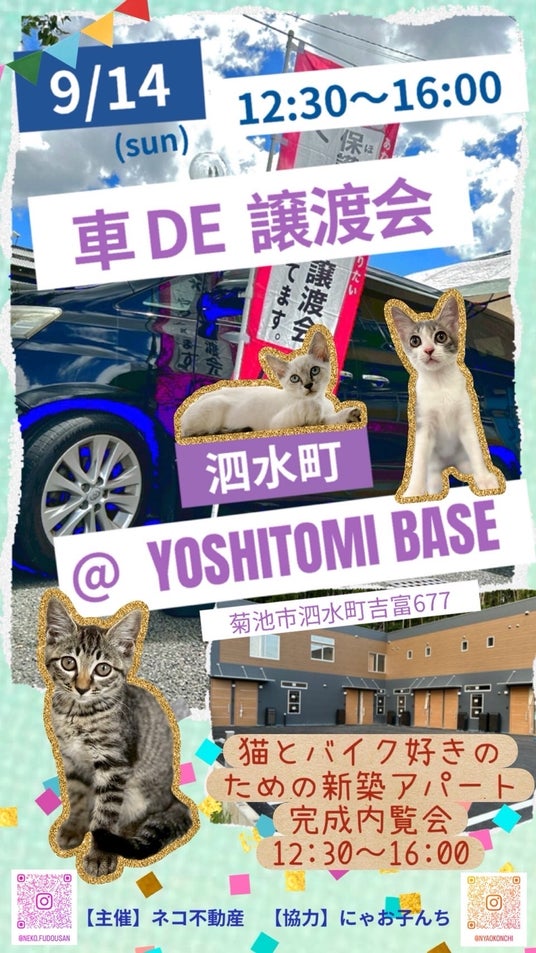 株式会社ネコ不動産は、猫とバイクを愛する方向けの新築アパート「YOSHITOMI BASE」の完成を記念し、2025年9月14日(日)に完成内覧会と保護猫譲渡会を同時開催いたします。